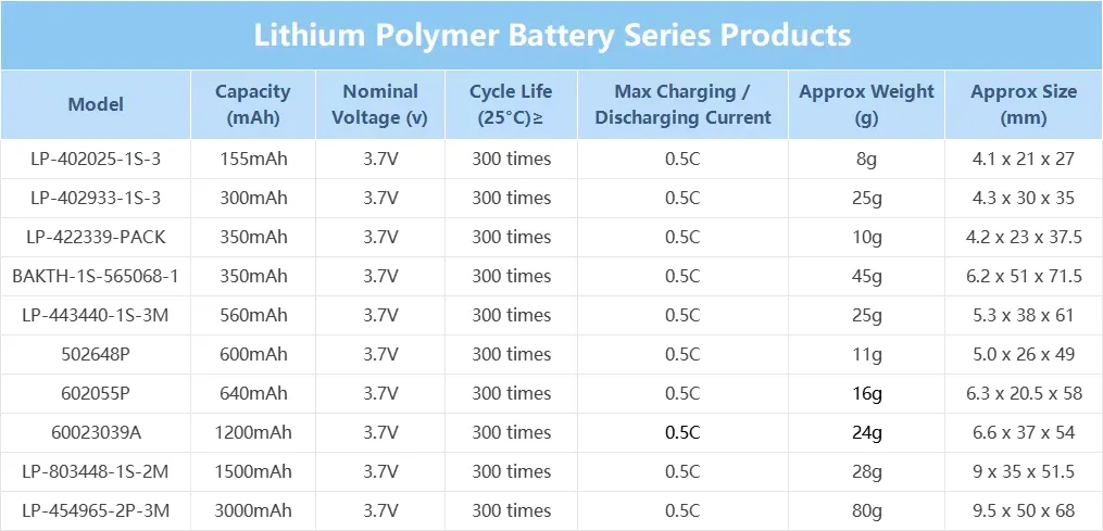 Technical Specifications: Chemistry: Li-po Nominal Voltage: 3.7V Nominal Capacity: 300mAh Nominal Energy: 1.11 Wh Max Charge Voltage: 4.2V Dimension: about 4.3*30*35 mm Weight: about 12g The LP-402933-1S-3 , a premium ultra-thin 3.7V 300mAh ...